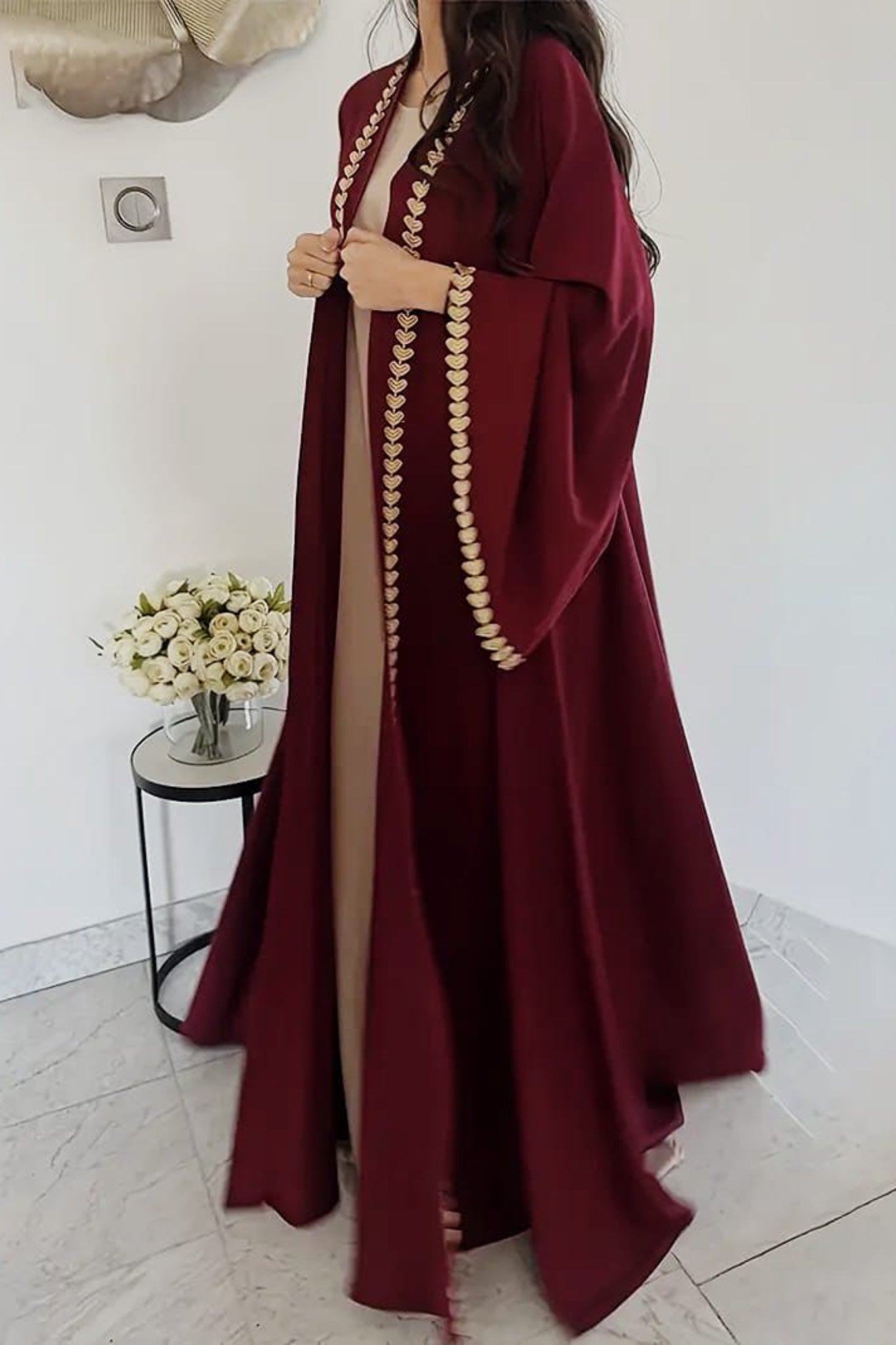 The Amirah Duster Coat features a luxurious peach fabric, offering a stylish Persian aesthetic ideal for summer conditions. Its lightweight design ensures breathability, providing comfort in warmer temperatures while maintaining an elegant appearance. The inner maroon layer adds a sophisticated contrast, enhancing the overall visual appeal.
